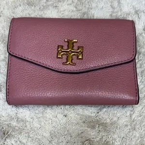 Tory Burch Kira wallet in mauve pebbled leather. Features the signature Tory Burch logo and a flap closure. Compact and stylish design.