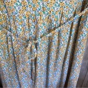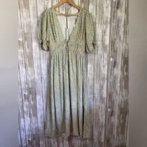 Featuring a delicate floral print, this dress is designed with a flattering smocked bodice, deep V neckline with tie detail, and soft puff sleeves for that perfect cottagecore silhouette. The lightweight rayon fabric drapes beautifully, making it ideal for warm-weather occasions.