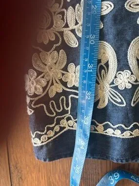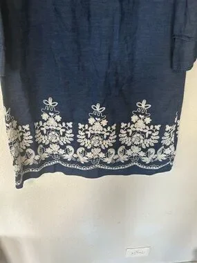 Navy tunic dress with white floral embroidery along the hem. Lightweight fabric with a relaxed, pull-on silhouette. Three-quarter bell sleeves add feminine detail. Versatile piece for casual or dressed-up looks, Cottagecore, Farmhouse Style