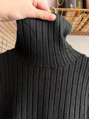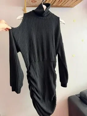 Sleek and flattering black ribbed midi dress featuring a cozy turtleneck and long sleeves. The soft knit fabric hugs the body comfortably, while the ruched side detail adds shape and a stylish, slimming effect. Perfect for fall/winter, work, or dressing up with boots and a coat.