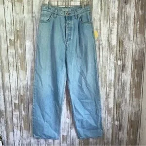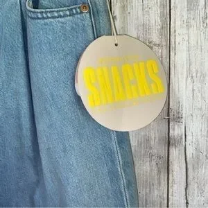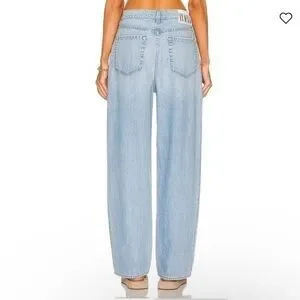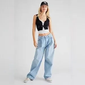 Designed with a dramatic high-rise waist, pleated front, and modern puddle/barrel leg fit, these jeans offer a fashion-forward take on classic denim. The “Just A Nibble” wash is a soft, versatile light blue perfect for year-round styling.