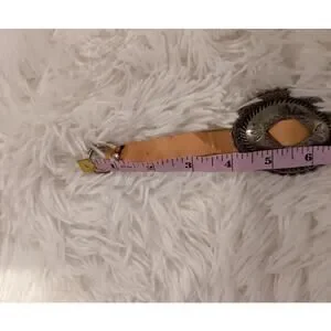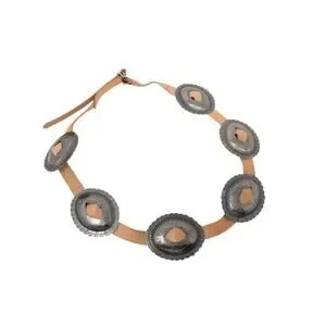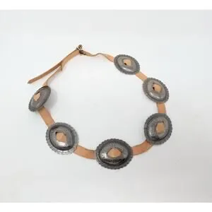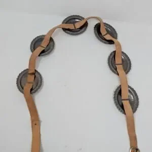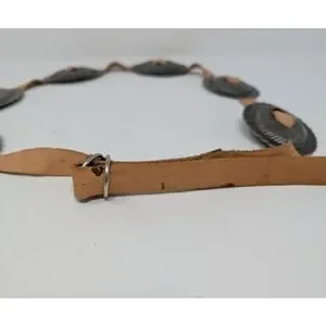 Condition: vintage worn condition. Visible patina on conchos. Leather shows wear, discoloration, and a darkened/burn mark near closure (see photos). Structurally intact and wearable.