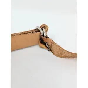 Vintage Western concho belt featuring etched silver tone oval conchos on natural tan leather strap. Classic Southwestern / boho cowgirl aesthetic with tooled detailing and scalloped edges. Likely 1970s–1980s era based on construction and style. Unbranded.