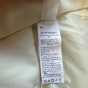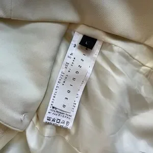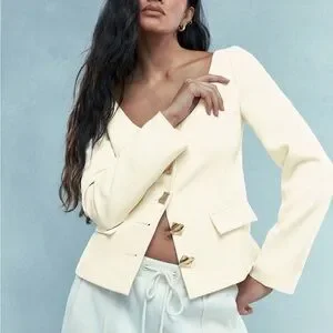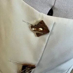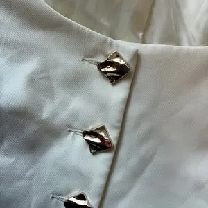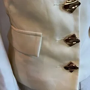 Elegant cream blazer with unique gold buttons. Features a scoop neckline and long sleeves. Perfect for formal occasions.