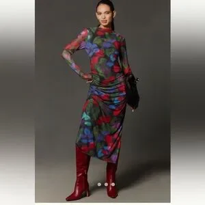 Anthropologie NWT Farm Rio Long-Sleeve Mock- Neck Mesh Slim Midi Dress size XS. Vibrant floral dress with long sleeves. Features a mix of red, blue, and green colors.