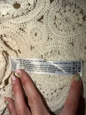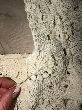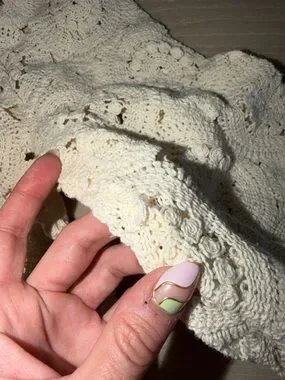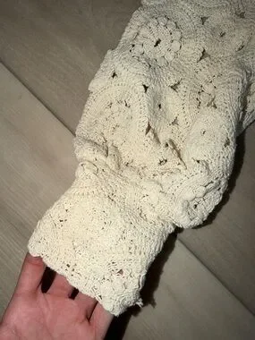 Cream crochet crop top with square neckline. Puff long sleeves and scalloped crochet hem. Intricate circular lace motifs throughout. Lightweight and breathable knit. Feminine, layered look for skirts or jeans.