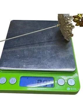 Crafted from brass, this vintage hat pin features a floral design with intricate detailing. Weighs 8.9 g and measures 10 inches long.