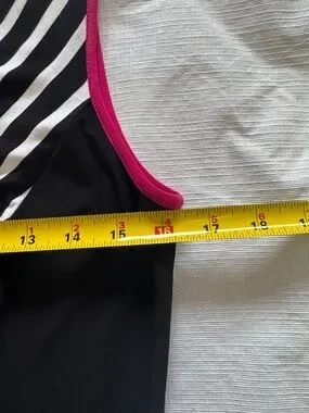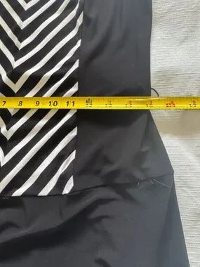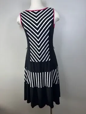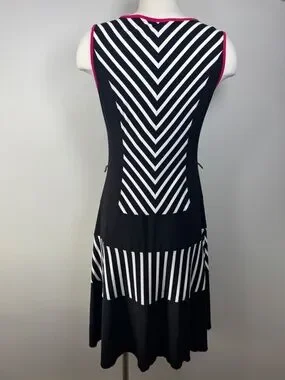 Sleeveless Joseph Ribkoff midi dress. Graphic black and white chevron and stripe panels. Flared skirt for easy movement. Pink trim accents neckline and armholes.
