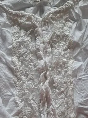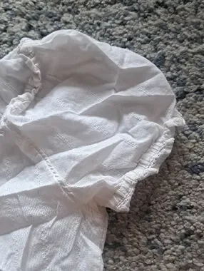 Soft white peasant blouse with intricate lace panel down the front. Short puff sleeves and a ruffled hem add feminine detail. Lightweight woven fabric for easy layering.