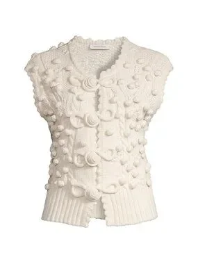 Sleeveless knit vest with raised pom-pom texture. Features decorative loop closures down the front. Chunky ribbed hem and scalloped edges. Feminine, tactile layering piece.