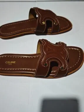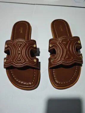 These Celine slide sandals feature the iconic Triomphe motif with decorative studs, crafted in smooth leather for a chic and comfortable slip-on style.