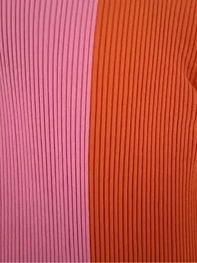 Staud sleek ribbed knit dress in a bold two-tone pink and orange. Features a deep V-neck and button-front for versatile styling. Soft stretch fabric flatters the silhouette. Perfect for day-to-night looks in standout colorblocking.