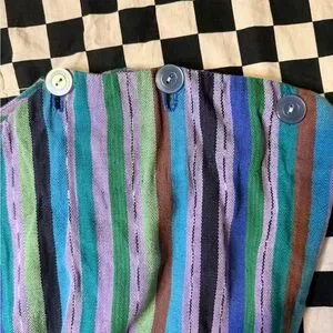 Lightweight striped jumpsuit with a flattering wide-leg silhouette. Features vertical blue, purple, green and black stripes for a versatile, colorful look. Easy pull-on style that pairs well with a belt or layered pieces. Comfortable and breezy for everyday wear.