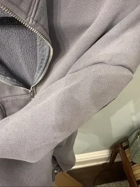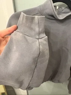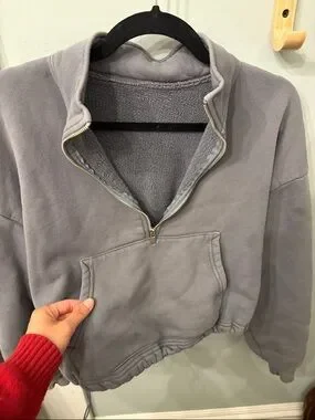 Cropped quarter-zip pullover with kangaroo pocket. Soft, casual fleece finish. Easy neutral blue-gray shade pairs with many outfits. This was set actives first iteration when the branch first started ten years ago! So I have had it for a while and loved it. Prices to reflect wear.
