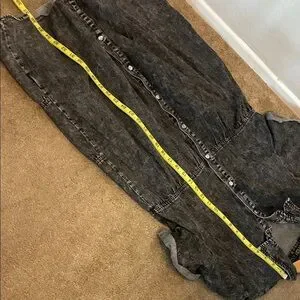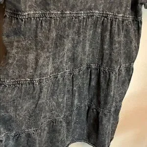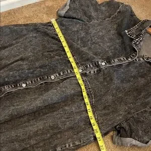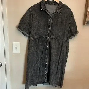 Stylish black denim dress with button-up front. Features short sleeves and a classic collar.
