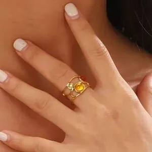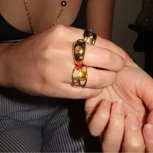 Stylish gold bracelet featuring vibrant red, yellow, and green stones. Perfect for a chic look.
