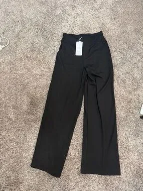 Wide-leg track pants by Love. Smooth black fabric with a relaxed fit. Elastic high waistband for comfort. Straight, flowing legs for versatile styling. Suitable for casual or elevated looks.