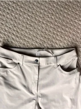 Smooth light cream performance pants. Subtle stretch fabric for comfort. Ideal for low-impact workouts or casual wear. Inseam: 26”, Total length: 37”