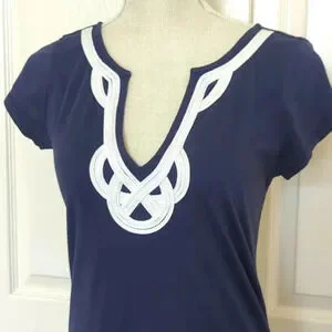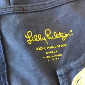 Lilly Pulitzer Brewster Blue White V Neck Dress. Navy blue dress with a white applique. 100% Cotton, some stretch to material.