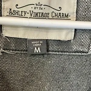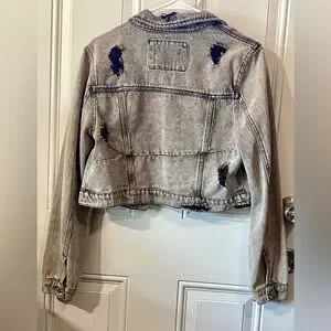Cropped distressed jean jacket in grey with frayed detailing. Classic button-front design and chest flap pockets for a timeless look. Lightweight denim with edgy distressed accents for everyday wear. Grey color adds versatile style to any outfit.