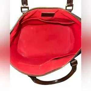 Louis Vuitton leather label on red fabric lining. Dark brown stitched leather tag with embossed logo. Classic luxury handbag interior detail.