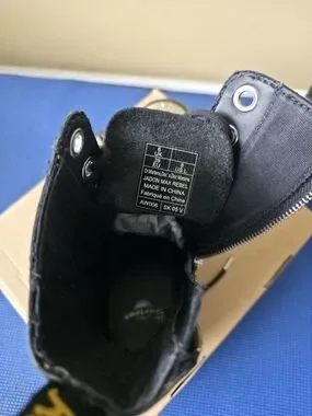 Tall black leather boots with lace-up front. Silver metal eyelets and zipper. Thick platform sole and bold tread. Signature yellow welt stitching detail. There's scuffs on toes and damage to zipper on the left boot