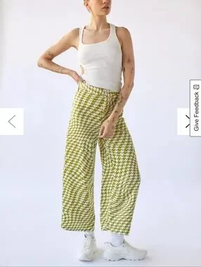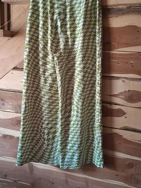 Comfortable wide-leg pants in an olive green houndstooth print. Soft, breathable fabric with a relaxed silhouette. Easy pull-on style for everyday wear. Olive green pattern adds a fresh, modern touch.
