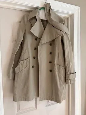 Classic double-breasted trench with a tailored collar. Front flap pockets and button closure. Belted neck strap and cuff details. Clean, versatile silhouette for layering.