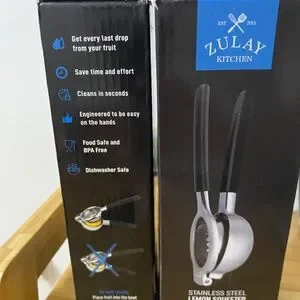 Durable Zulay lemon squeezer. This stainless steel citrus juicer has non-slip grip handles. Large bowl design, 8.7 inches long with a 2.9 inch bowl. Great for lemons, limes, oranges, fresh juice anytime.