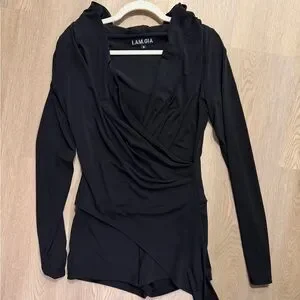 Chic black hooded mini dress with a plunging V-neck and long sleeves. Sleek silhouette highlights the waist and features an asymmetrical hem for added style. Versatile black color perfect for evening events and nights out.