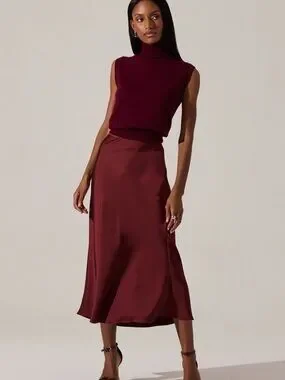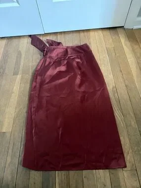 Flowing high-low wrap skirt by Express. Rich burgundy color with a self-tie waist. Soft drape and feminine silhouette. Easy to dress up or down.