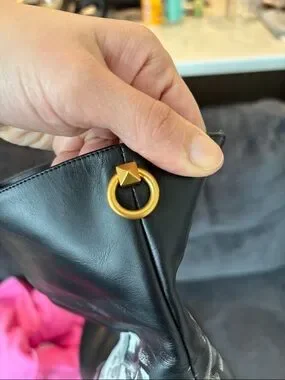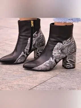Sophisticated black leather ankle boots by Valentino Garavani. Gray floral embroidery wraps the heel and sides. Side zipper with gold-tone pull for easy on and off. Block heel provides steady support. Elegant detail for elevated looks.