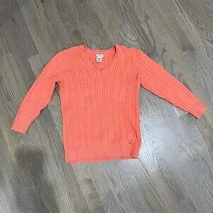 A brighter layer is hard to find. This IZOD pullover sweater in tangerine orange adds instant preppy polish without trying too hard. The V-neck is easy for layering over a tee or collared shirt, while the cable-knit front and ribbed hem/cuffs keep the look classic. 3/4 sleeves make it perfect for in-between weather, office casual, or weekend errands. 100% cotton, women’s size Small, regular fit. Condition: Pre-owned.