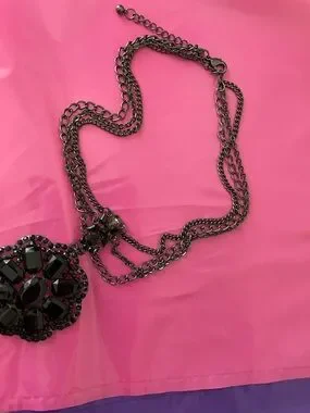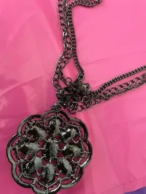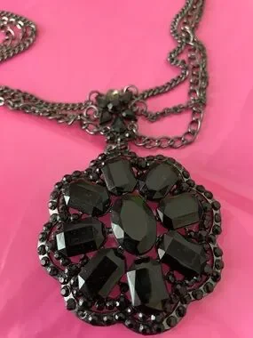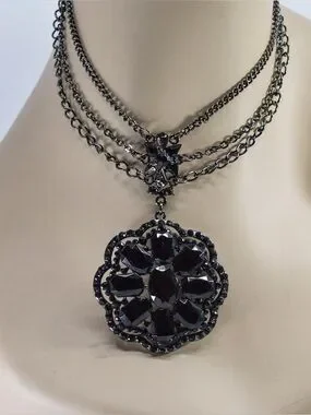 This Vintage Anna Sui necklace features a dark metal, triple strand chain and a large, ornate pendant adorned with black rhinestones.