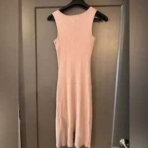 Sleeveless ribbed midi dress in soft blush pink. Fitted silhouette with a decorative side button placket. Subtle slit created by button detailing. Lightweight, stretchy knit for easy wear.