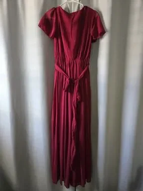 Elegant wine red wrap maxi with a deep V-neck. Short flutter sleeves and a cinched elastic waist. High side slit for graceful movement. Lightweight, flowy fabric for soft drape.