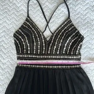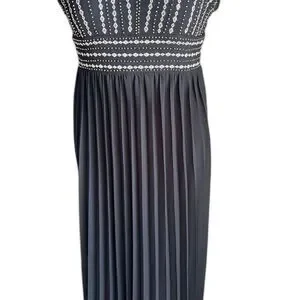 Lightly textured woven fabric is formed to adjustable spaghetti straps (that cross at the back), and a princess-seamed bodice with gold beads and embroidery. Fitted waist tops the Georgette maxi skirt with accordion pleats. Hidden back zipper/clasp.