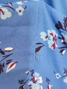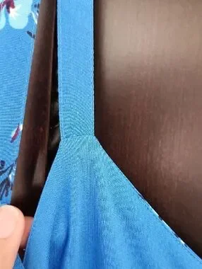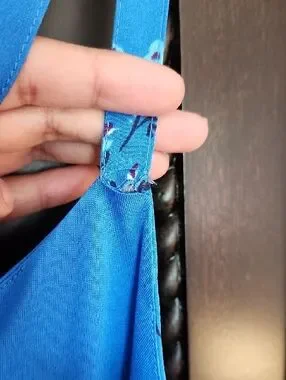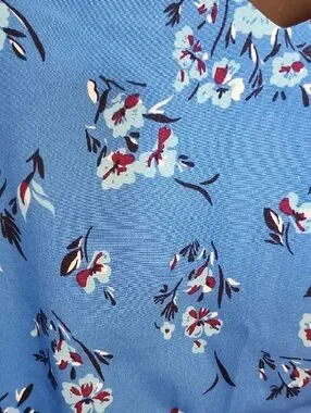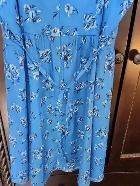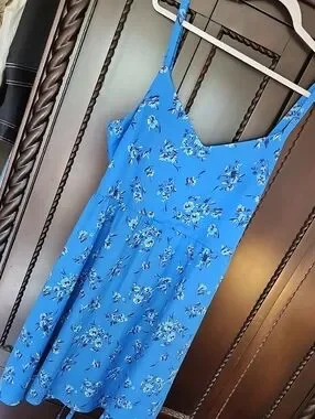 Bright blue sundress with delicate white and navy floral print. Spaghetti straps and a fitted waist. No adjustable straps, does hang a little low in the bust. Flowy skirt for a breezy look. Perfect for warm days or layering. See images for minor wear.