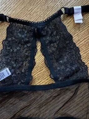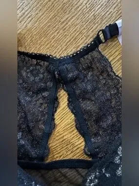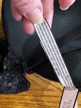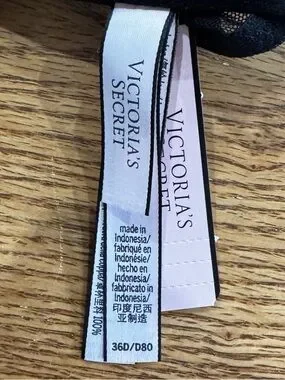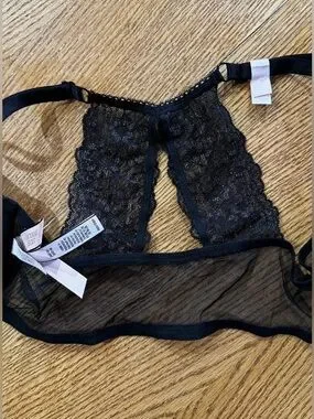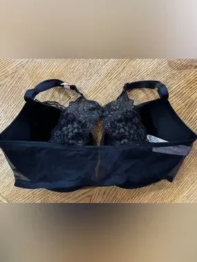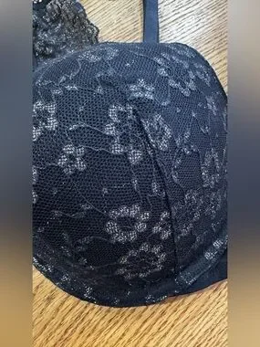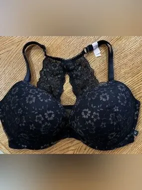 Victoria's Secret push-up bra with molded cups for lift. Black floral lace overlay with delicate shimmer. Racerback lace panel adds feminine detail. Adjustable straps for customized fit.