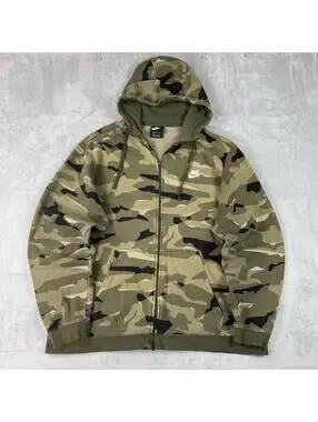 Features: All-over camouflage print, full zip closure, fleece lined interior, front kangaroo pockets, embroidered Nike logo