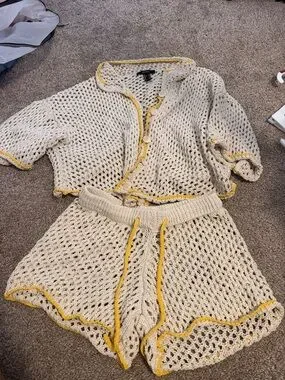 Forever 21 Cream Crochet Two-Piece Set with Yellow Trim