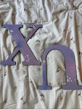 Pair of wooden decorative letters painted in a purple ombre with subtle blue accents. Hand-painted star and swirl detailing. Lightweight and ready for display. Great for shelving or wall decor.