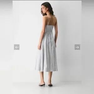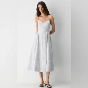 This is a V-neck fit-and-flare dress with a smocked back and adjustable straps. It’s made from stretchy cotton poplin with a crisp, airy feel that’s smooth to the touch. This version features an exclusive, custom-designed stripe pattern.