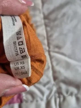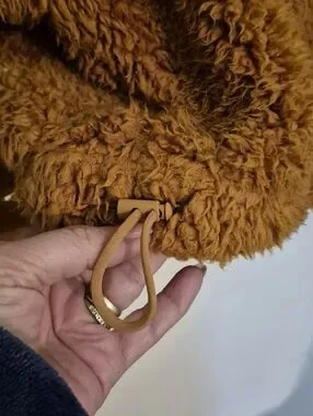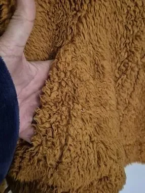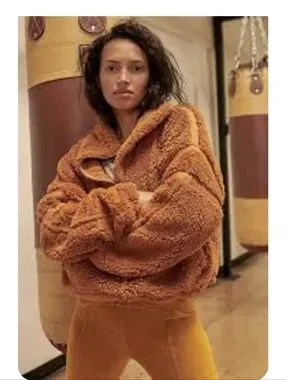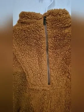 Plush high pile teddy fleece pullover with half-zip and stand collar. Slouchy,oversized silhouette.Elasticized cuffs and drawcord adjustable waistband.Soft, warm texture ideal for casual wear. Subtle sleeve detailing and drop shoulders. SZ.XS pit-pit 25",21" long In good pre-owned condition color is toasted coconut orange