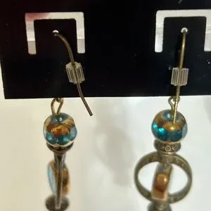 Add a touch of elegance with these stunning earrings. Hand crafted with blue and gold glass beads and Bronze coloured findings. They dangle and bring out the fun side of you or the delicate side.