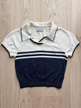 Aritzia TNA Assembly Knit Cropped Polo Sweater Navy White Stripe 2XS