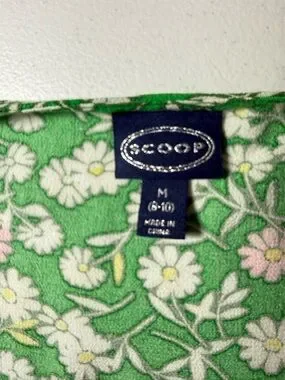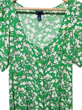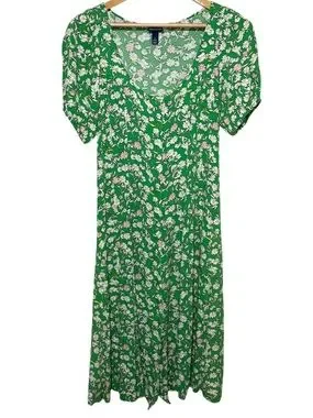 Scoop Floral V-Neck Midi Dress Short Puff Sleeves Spring Summer Party Green M