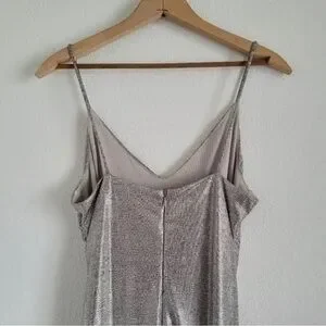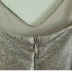 Size 2 Shimmery Silver Evening Dress Has A Slight Gold Shine And A Beautiful Simplicity. Stunning In Bright Light. Hidden Back Zipper. Tasteful Side Leg Split.