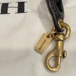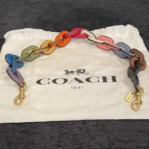 Coach leather link strap in a rainbow of vibrant colors. Interlocking leather links create a playful statement. Gold-tone hardware and Coach tag accent the design. Easy to attach to most bags for an instant style update.