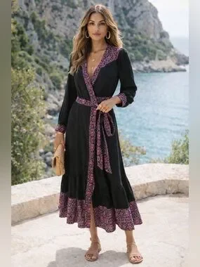 Brand new with tags Allison New York wrap dress featuring a flattering, feminine silhouette with bold pink and purple patterned trim. A standout piece that blends classic elegance with a modern boho vibe.